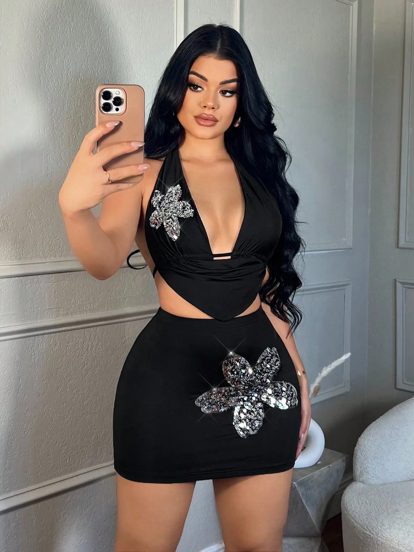 Be the first to review “Sequined Knitted Draped Neck Top & Skirt, For Date Night Birthday Casual Sexy Fall Winter”